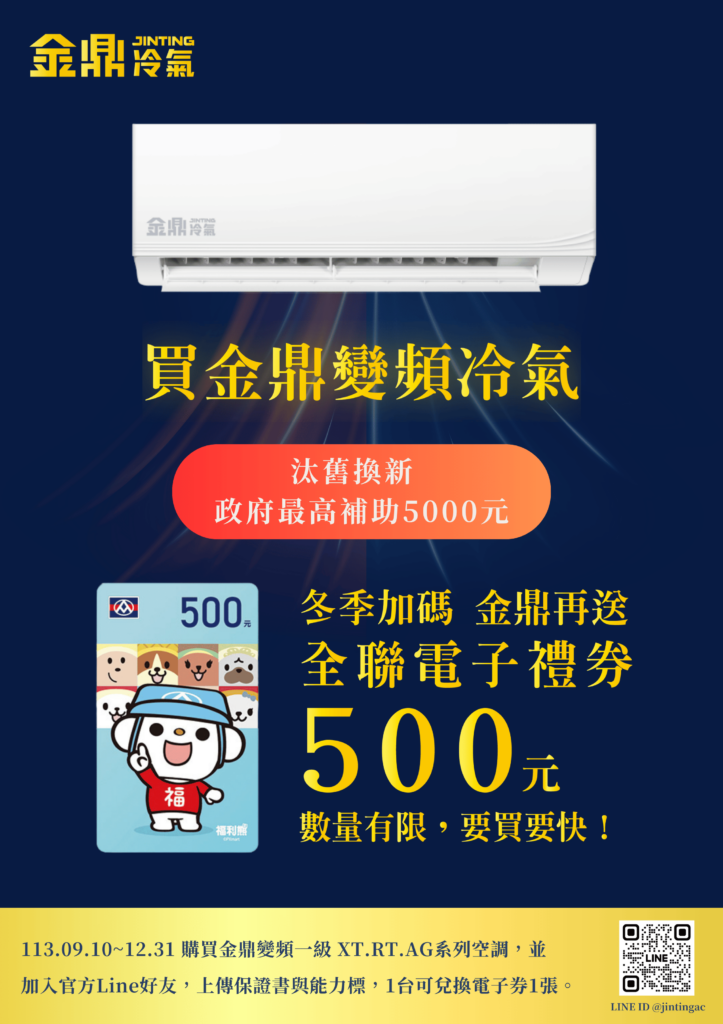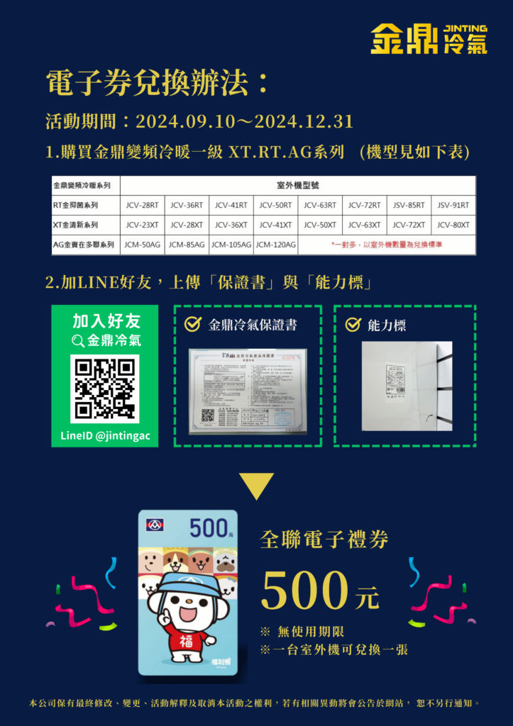 活動辦法:1.於活動期間購買金鼎冷氣變頻一級 XT、RT、AG系列空調,並透過金鼎冷氣官方Line、上傳金鼎冷氣有效之保證書與能力標者,經官方審核後,符合活動辦法規定者,將提供全聯電子券(價值$500元) 1張。2.兌換券以購買室外機機台數量為準,1台可兌換1張。3.非活動期間購得冷氣機者,不在此兌換活動兌換名單中。
