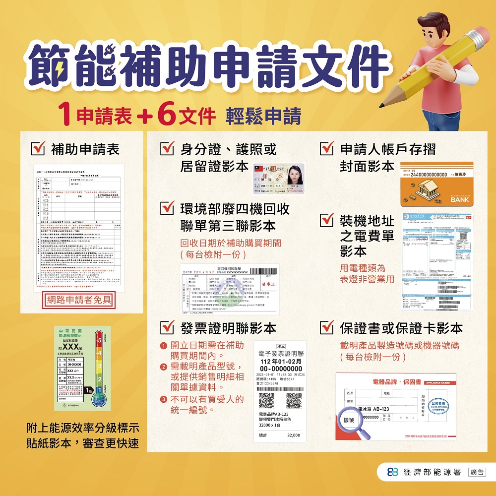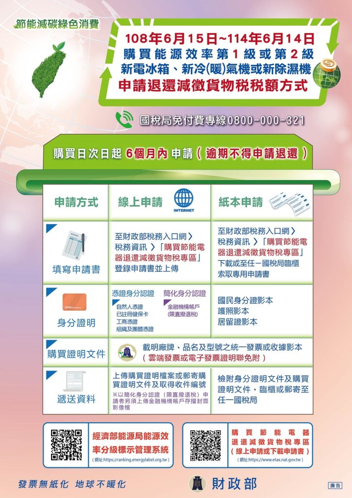 2024-07-112024-07-11 家電汰舊換新-最高補助5000元,分成財政部與經濟部兩種申請管道: 財政部 節能電器貨物稅退稅經濟部 住宅節能家電補助 金額2000元3000元 時間2025/6/14 前2024/12/31 前 經費用完為止 教學網址影片教學(點我)影片教學(點我) 政府網站說明政府網站(點我)政府網站說明(點我) 申請連結申請連結(點我)申請連結(點我) 財政部補助文件 財政部補助諮詢(點我) 經濟部補助文件 經濟部補助諮詢專線:02-29559666 Share
